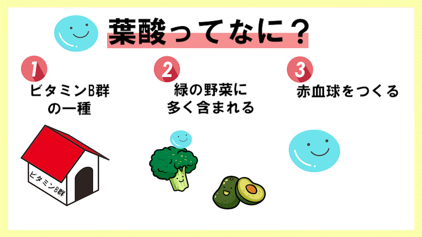 葉酸には赤血球の形成に重要な役割があるため、貧血の予防や改善効果が期待できます。