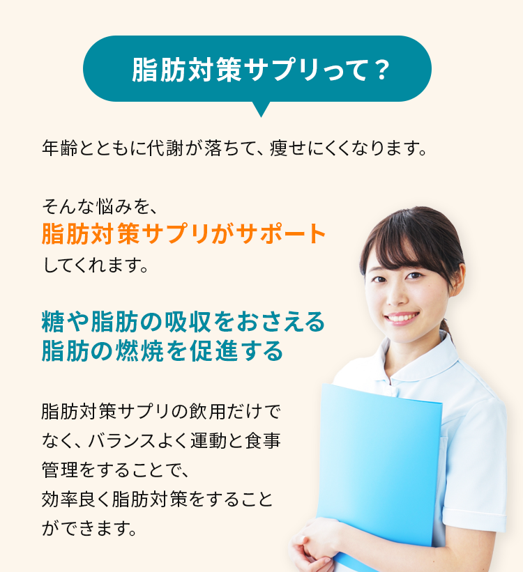 脂肪対策サプリの飲用に加えて、バランスよく適度な運動と食生活の是正も推奨とされています